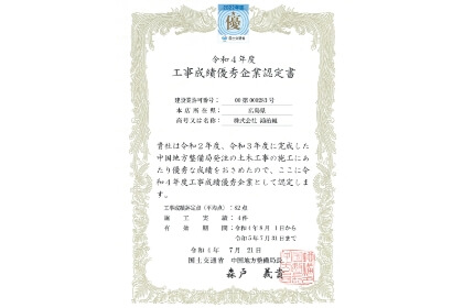 土木部門 国土交通省 中国地方整備局 『令和3年度 工事成績優秀企業(ゴールドカード)』認定 『令和3年度 中国地方整備局 局長表彰』(最高表彰)受賞