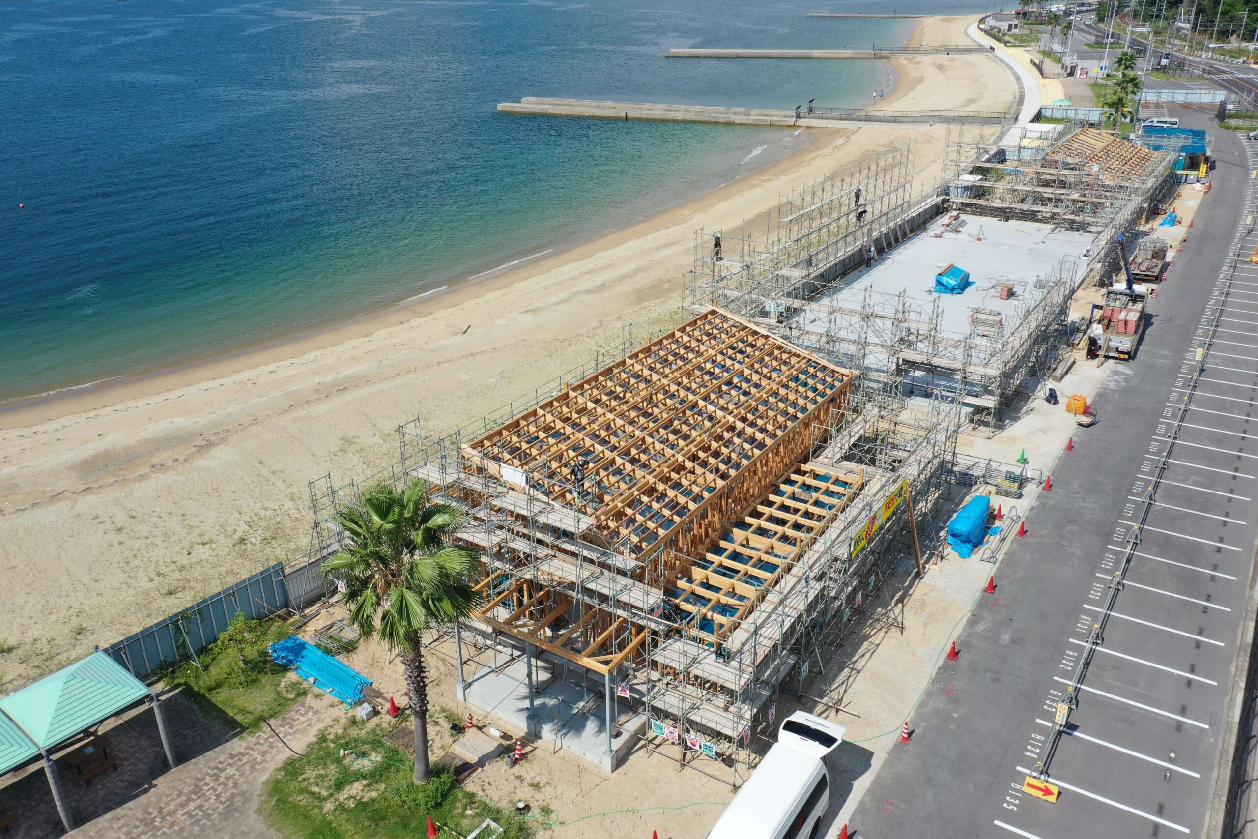 「ベイサイドビーチ坂」に木造の物販、飲食施設が完成しました