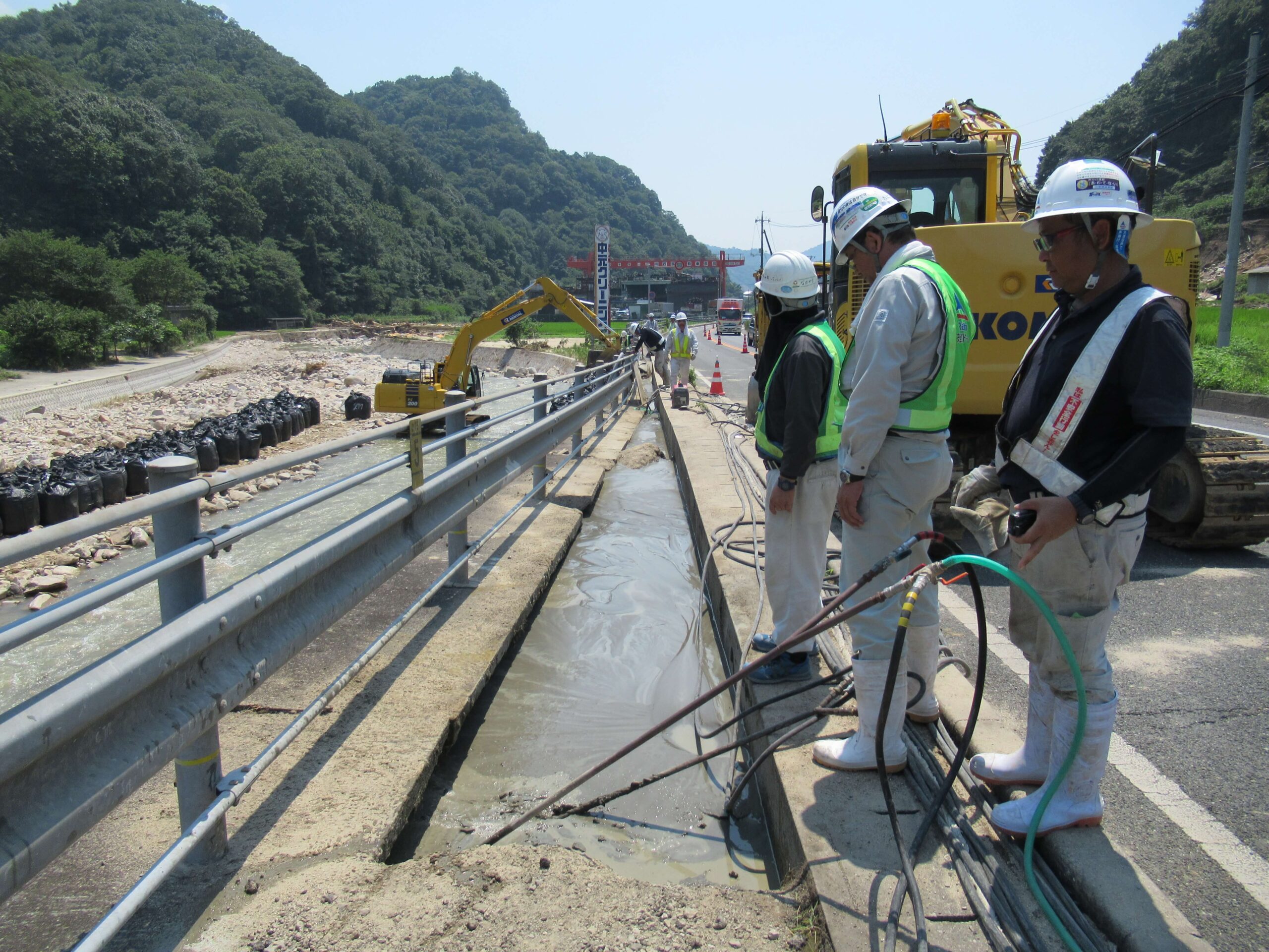 平成30年7月豪雨災害において、当社は発災直後より広島市安芸区、坂町、海田町、府中町などにおいて、応急復旧活動に取り組みました。現在は、そうした被災地の本格的な復興に向けて、復旧工事を行っています。