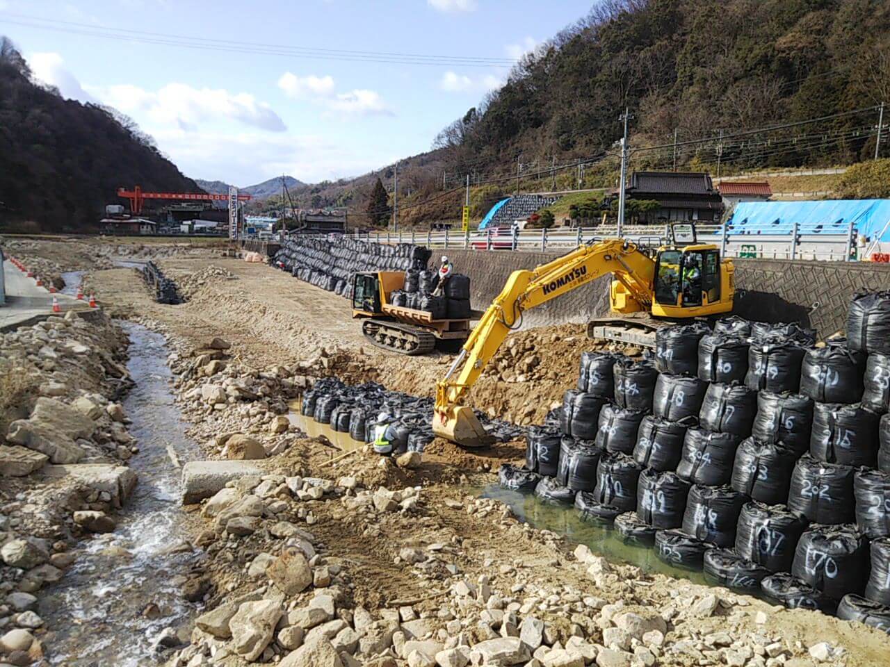 重機等の搬入、工事を進めるための進入路を造っています。 その後、土のうを撤去します。 |