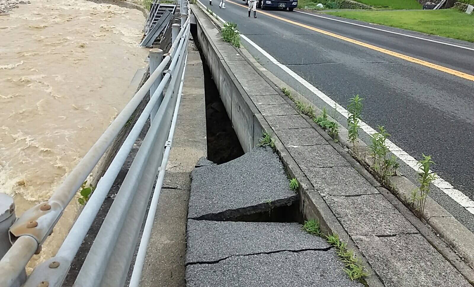 豪雨の影響により、瀬野川護岸が川底より浸食されたことから、並行して走る国道2号の車道や歩道の一部が陥没しています。 |