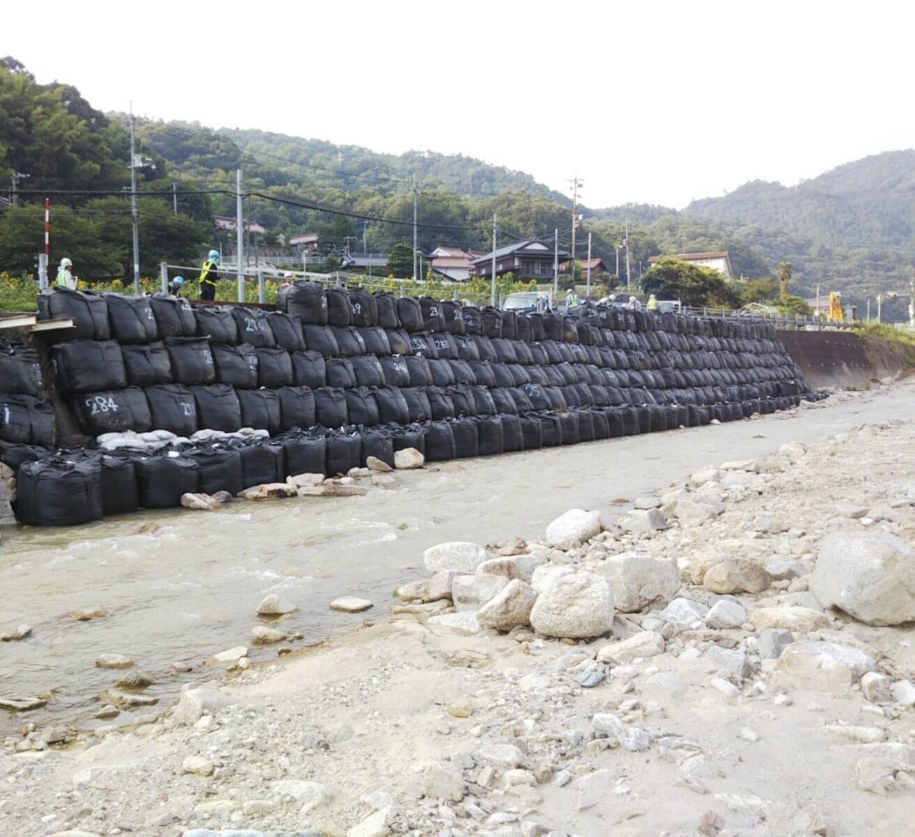 一時的に浸食被害の拡散を防ぐため、浸食された護岸には大型土のうを設置します。 移動式クレーンを用いて大型土のうを一つづつ隙間なく設置していきます。 |
