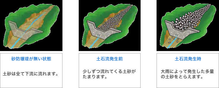 とは 砂防堰堤は上流からの土石流による災害を防ぐために渓流に設置する構造物です。土石流を食い止める働きのほか、土石を止めて渓流の勾配を緩やかにする働きや一度に大量の土砂が下流に流れ出ることを防ぐ働きがあります。