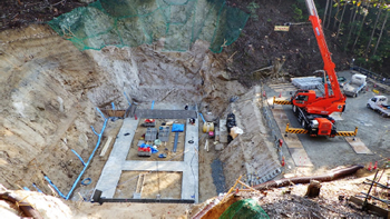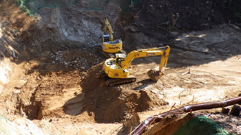 底版部掘削作業 基礎支持地盤を掘削しています。 堰堤を支える岩盤の支持層まで掘削を行っています。 |