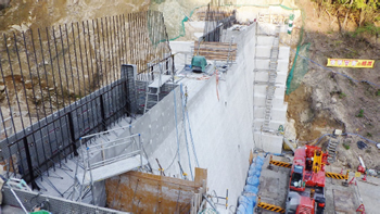 堰堤底板基礎部作業 残存型枠による基礎コンクリート作業です。 残存型枠にコンクリートを打設して、堰堤基礎部分を作ります。 |