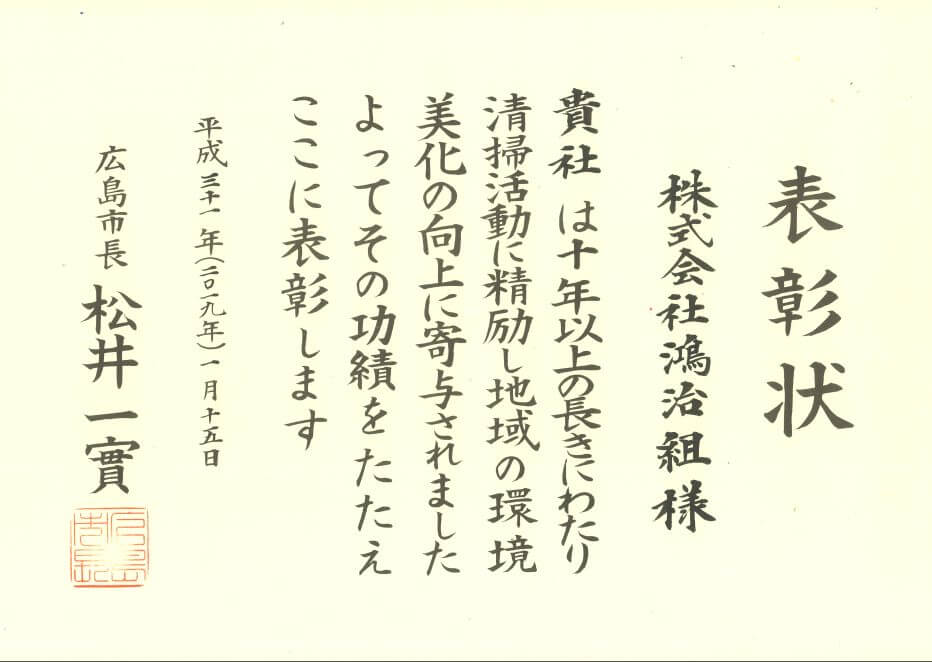 昨年、長年に亘る活動が認められ、広島市より「環境美化永年活動表彰」を受賞しました。