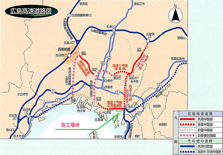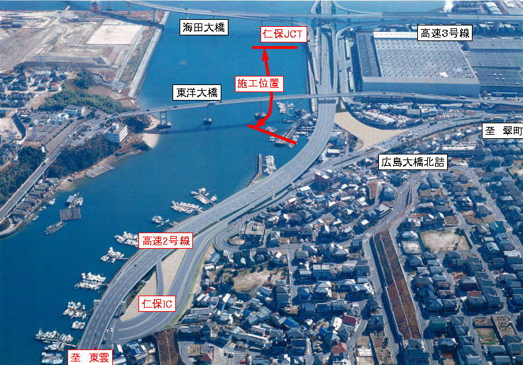 仁保ジャンクションは高速2号線、高速3号線、広島呉道路、海田大橋を連結する重要なジャンクションであり、平成22年春の高速2号線の完成により、広島都市高速網のネットワーク化は一層促進します。