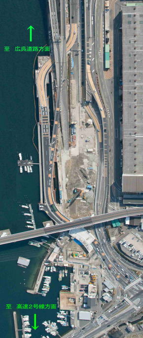 現在は仁保JCT下部工事施工に伴い、海田大橋、高速3号線、広島呉道路への通行を確保するため、既存の道路に仮橋及び切廻道路(黄色部分)が仮設置されています。(オレンジ部分は完成予定新設路)
